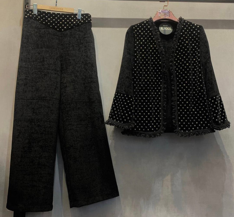 ست کت شلوار مخمل نگین دوزی نرمین، دارای دوسایز مناسب تا سایز ۴۸ می باشد. نگین های به کار رفته همه بصورت دوخت بود و تورهای ظریفی که لبه های لباس استفاده شده ظاهر به روز و مدرنی ایجاد کرده است. دوخت کار کاملا مزونی و تنخور عالی می باشد.